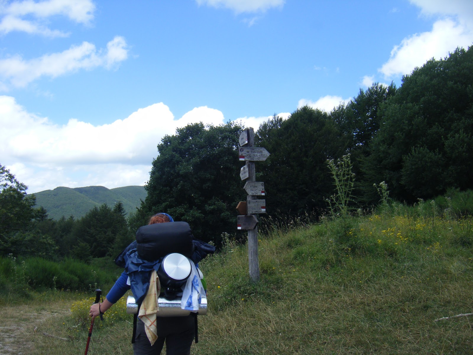 Noi invece saltiamo l'incrocio e proseguiamo per poco più di un kilometro di strada sterrata, che taglia il ripido versante est delle fontanelle, fino alla sbarra all'imbocco con la strada asfaltata che viene dal Passo. La seguiamo a sinistra e dopo 20 minuti ci fermiamo a fare colazione al bar del Rif.o la Capanna, luogo di partenza della sciovia per le frequentatissime piste invernali. Ripartiamo sempre lungo la strada immersa nella faggeta, senza abbandonarla mai fino al Passo della Calla 4 km più avanti. Giunti al passo, dando fiducia alla carta, facciamo un'altra deviazione alla ricerca di un bivacco per la notte;scendiamo quindi lungo il segnavia 82 verso il Passo di Giogarello, dove viene segnato un bivacco che ad oggi altro non è che un barcollante raggruppamento di assi di legno circondate dall'erba alta, tenute in piedi da una arrugginita stufa che ormai funge da colonna portante. Decidiamo di scendere ancora per 1 km,