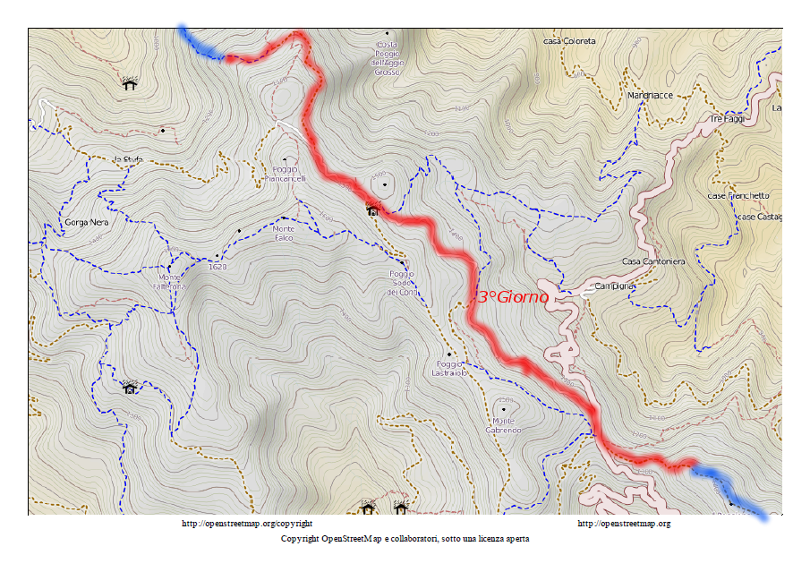 al M.te Falco lungo la Pista del Lupo. Arrivati a quota 1650 circa, si scende sulla sinistra per 3 km e 1/2 più o meno costanti fino al Passo della Calla (1295 mt) attraverso Poggio Sodo dei Conti, Poggio Lastraiolo ed i prati della Burraia.